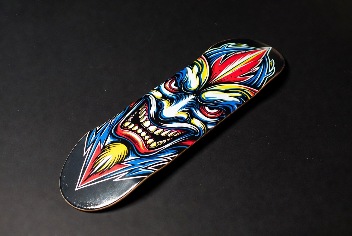 Unique skateboard deck design displayed on a table