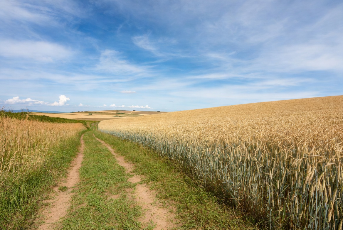 agriculture, clouds, countryside, crops, dirt, farming, field, grass, greenery, harvest, horizon, landscape, nature, outdoor, path, rural, sky, summer, sunlight, wheat