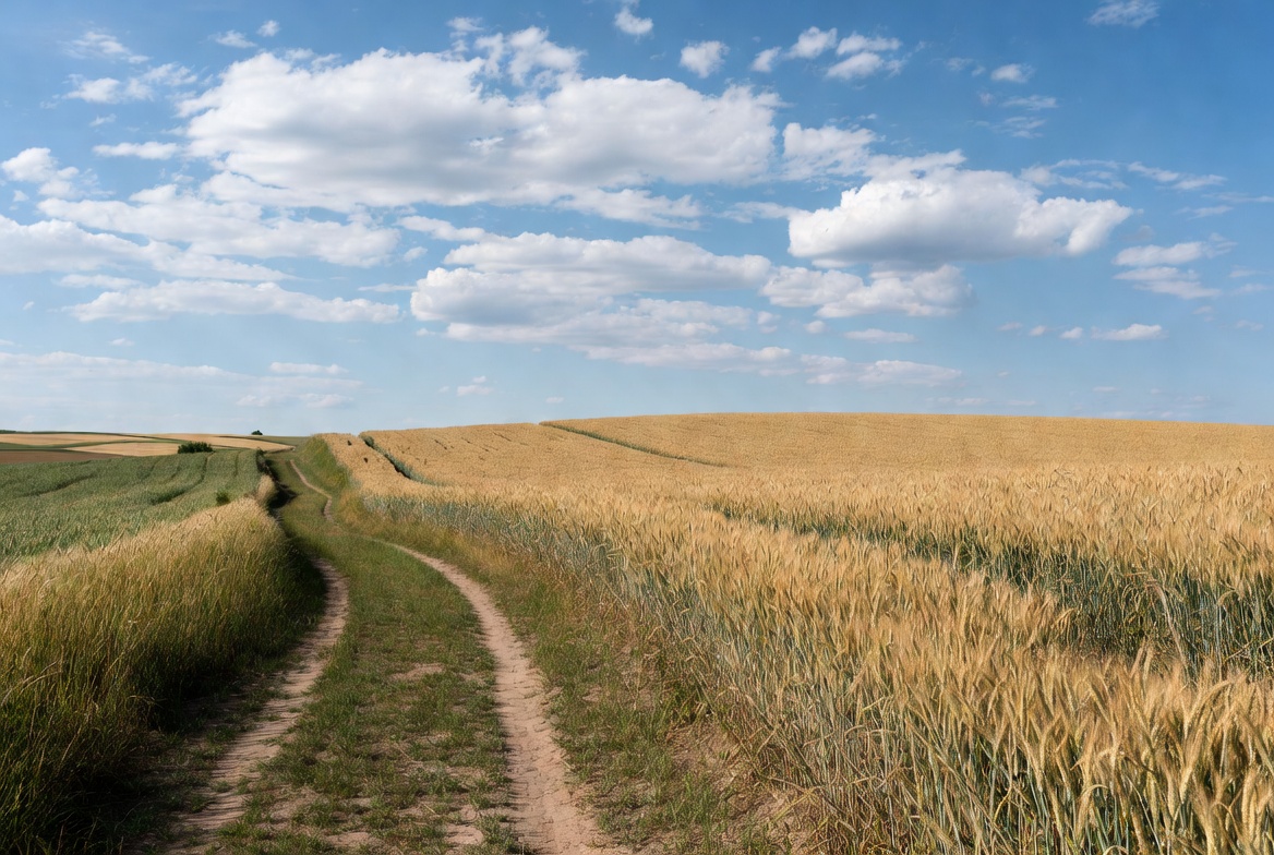 agriculture, agriculture activities, clouds, countryside, crops, dirt road, farming, fields, growth, horizon, landscape, nature, outdoors, path, rural, sky, soil, summer, sunlight, wheat