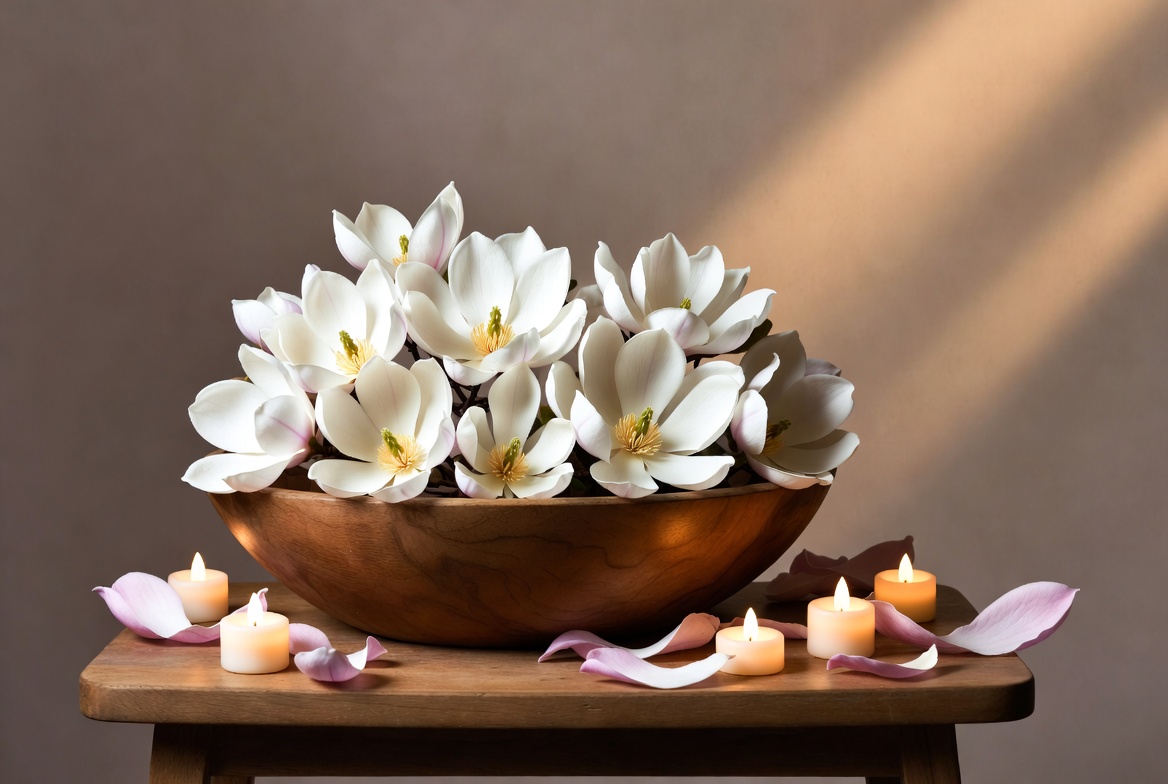 ambiance, calm space, candles, centerpiece, decor ideas, decoration, floral arrangement, flower petals, home decor, interior design, lighting, natural elements, organic materials, petal, relaxation, simplicity, still life, table setting, white flowers, wooden bowl