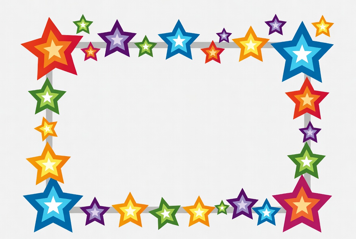 Bright stars in various colors create a decorative frame for events, work, or projects. The design highlights creativity and fun.