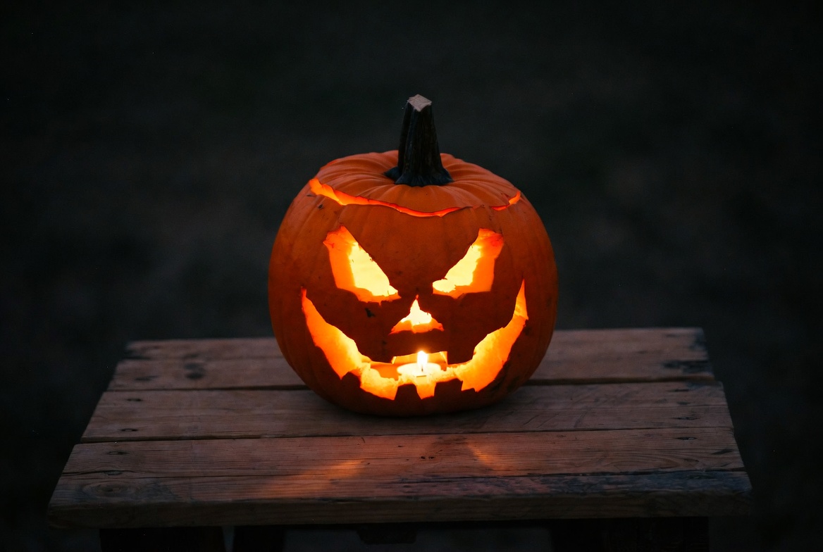 A carved pumpkin sits on a wooden table, lit from inside. The spooky face glows in the dark at night during Halloween.