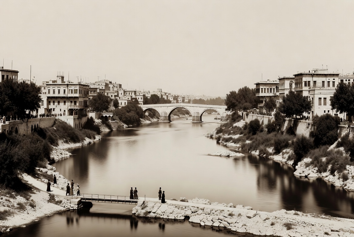 River scene with bridge and people