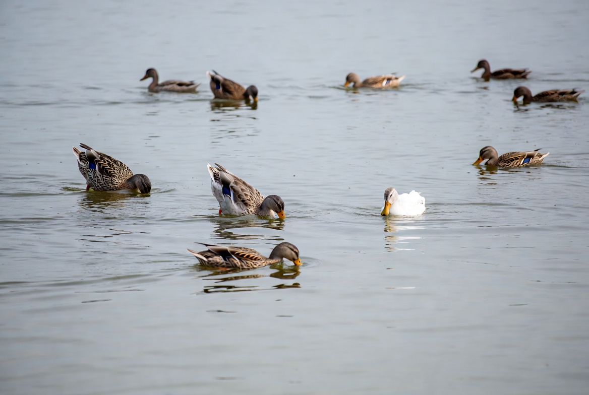 Ducks are swimming and foraging in a body of water. Some ducks are diving while others are floating. The scene shows calm movement.