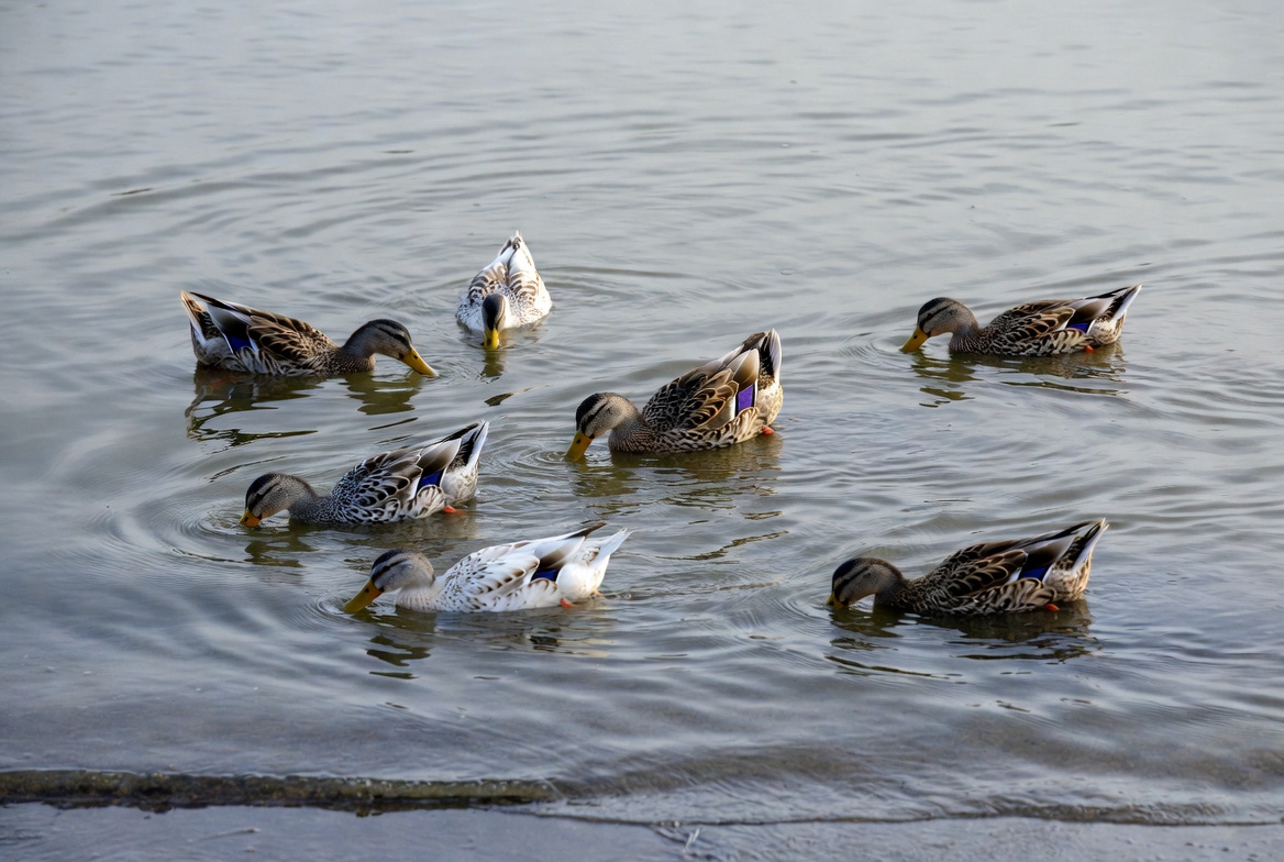 animal behavior, birds, daytime, ducks, ecology, feeding, foraging, freshness, group, habitat, lake, nature, outdoor, reflections, ripples, shore, surface, swimming, water, wildlife
