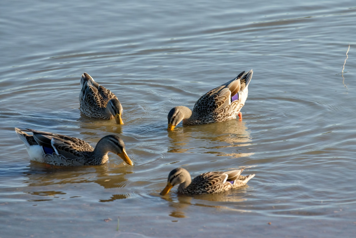 animal behavior, avian, birds, ducks, fauna, feeding, food, habitat, lake, nature, outdoor, pond, ripples, searching, sunlight, swimming, tranquility, water, wetland, wildlife