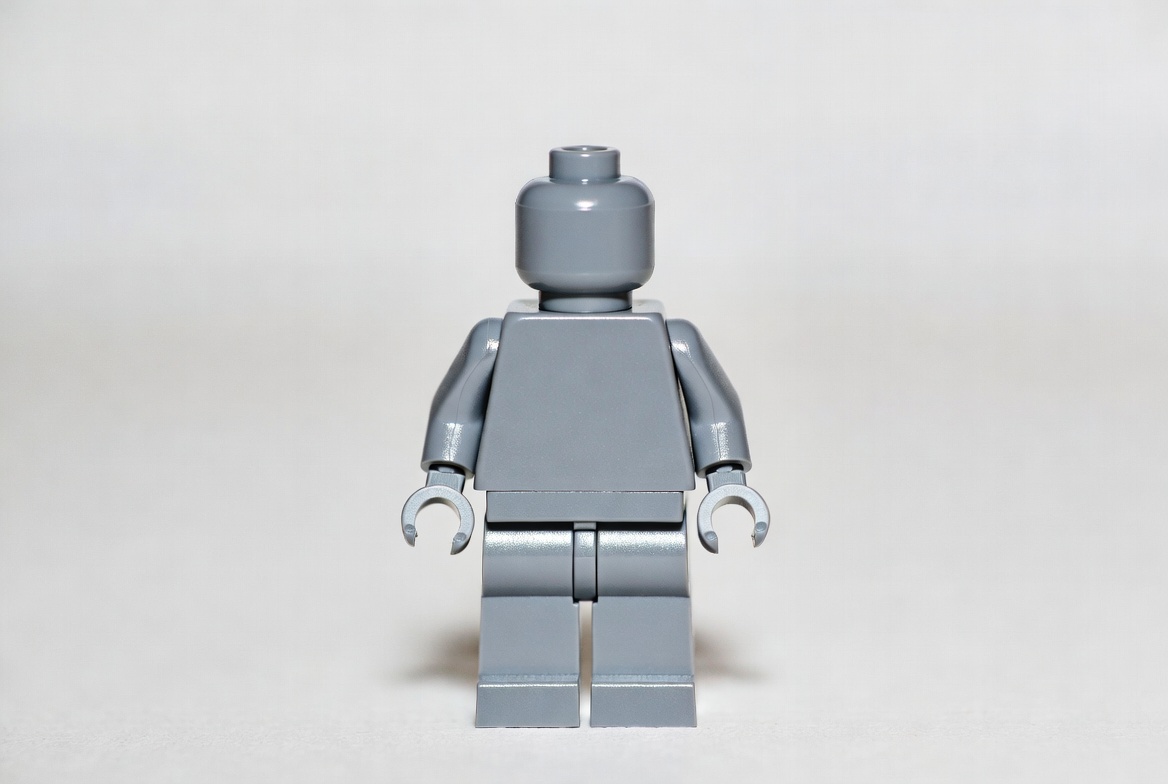 Gray lego figure stands upright in studio