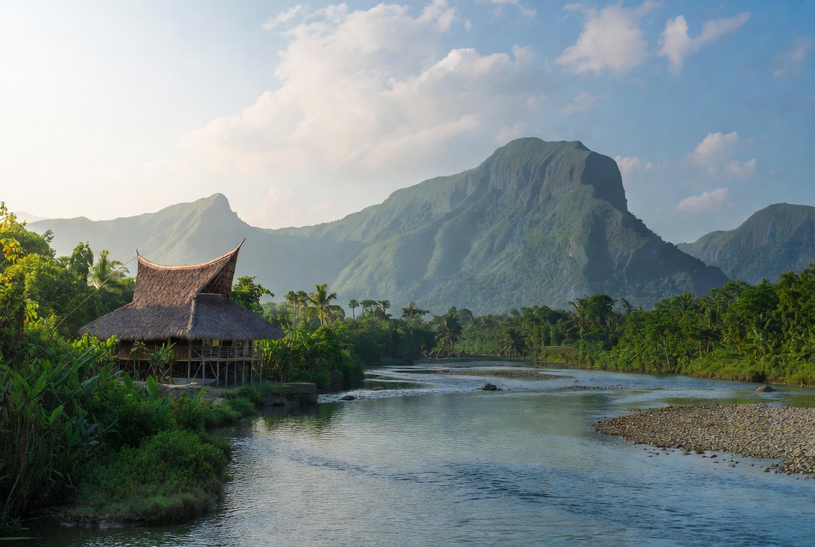 A river flows past a wooden hut surrounded by lush greenery and mountains under a clear sky in the early afternoon light.