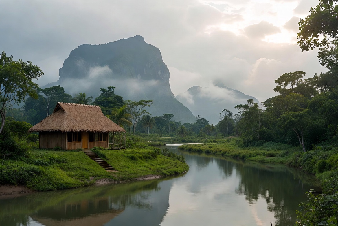 A hut stands by a river with mist-covered mountains in the background. Trees surround the area as clouds hover above.