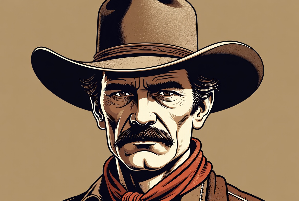art, brown, character, classic, cowboy, culture, detail, expression, face, figure, hat, heritage, illustration, man, portrait, rugged, scarf, strong, style, western