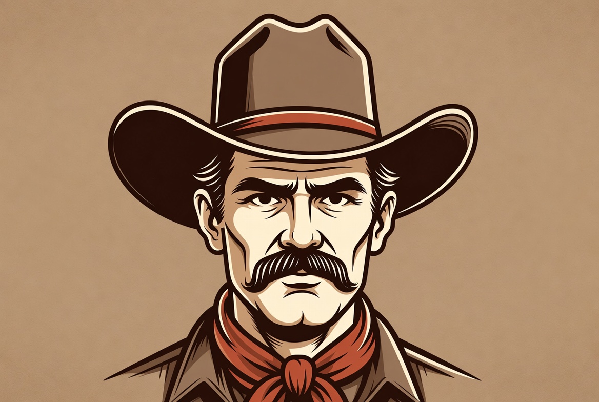 Americana, accessories, background, bandana, character, clothing, cowboy, culture, facial expression, hat, man, masculine, mustache, portrait, rugged, serious, style, vintage, western, wild west