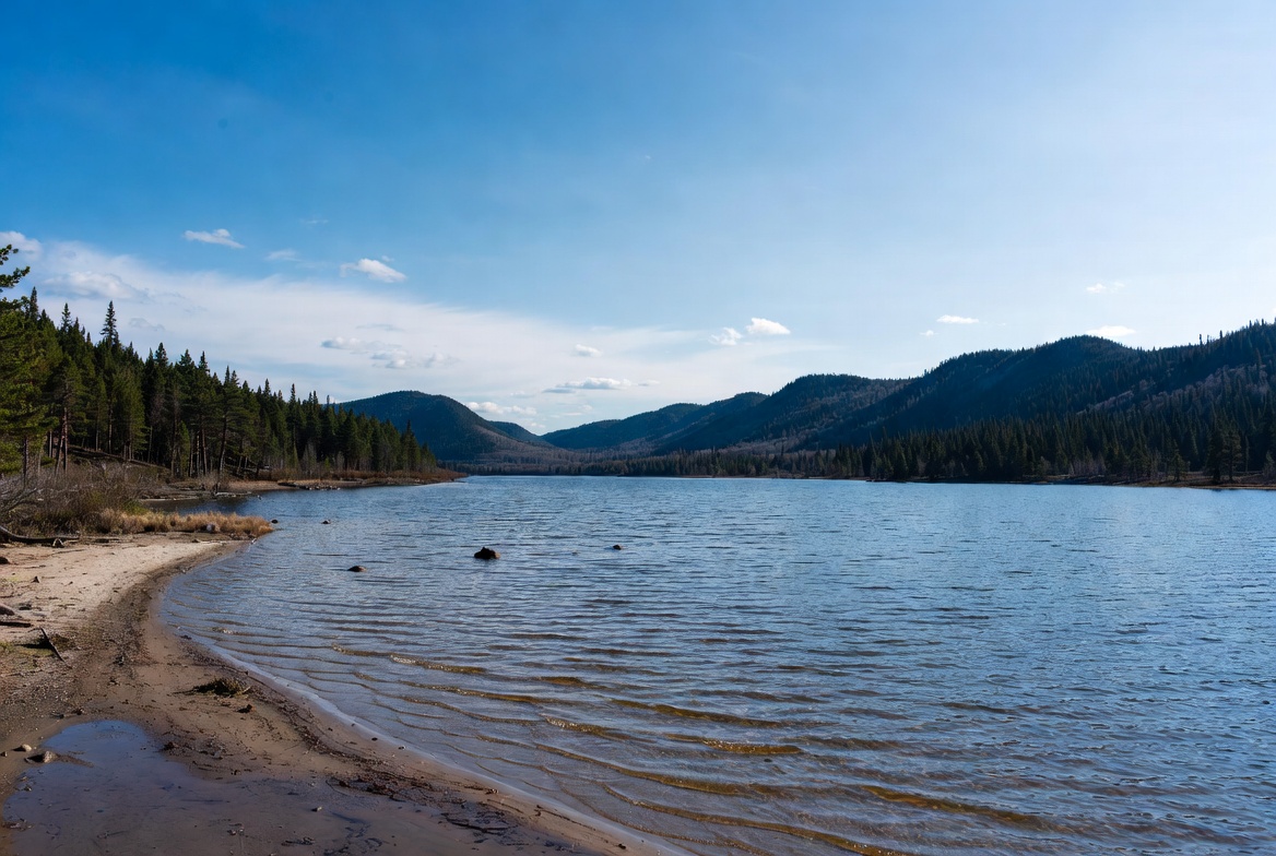 A lake surrounded by mountains and trees on a clear day. The water reflects the sky and the shoreline has sand and rocks.
