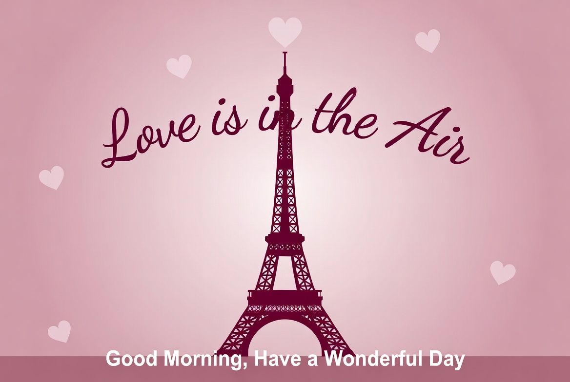 Eiffel Tower stands tall in Paris under a pink sky with hearts. A message wishes good morning and a wonderful day to everyone.