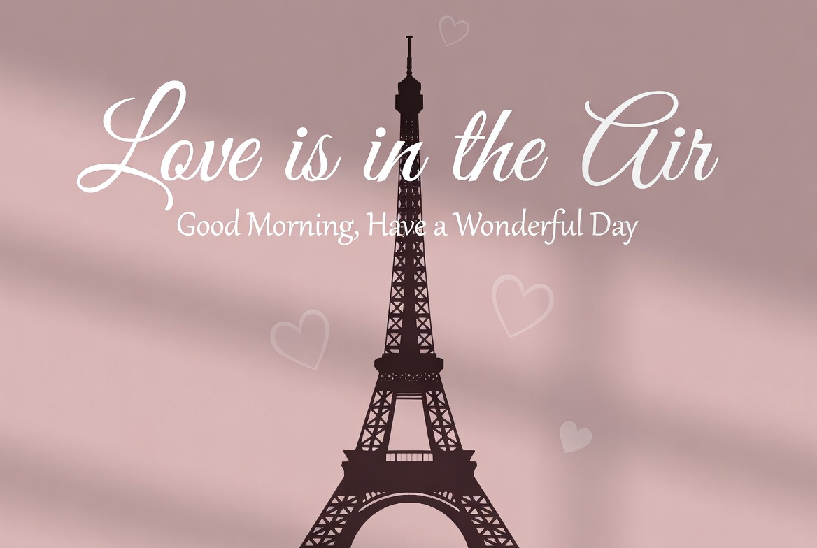 A message about love appears with the Eiffel Tower design. The scene conveys a warm feeling to start the day in Paris.