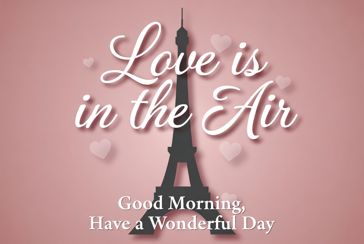 A card displays a design with the Eiffel Tower and hearts. It has a morning greeting and wishes for a wonderful day ahead.