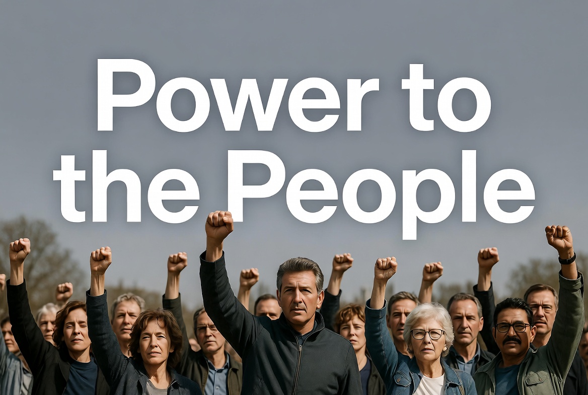 People gather outdoors with raised fists in support of a common cause. Their expressions show determination for change and justice.