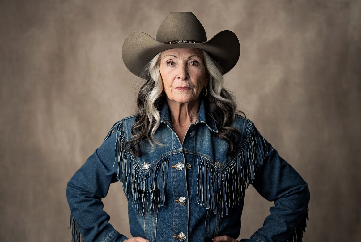 age, attitude, character, confidence, cowboy, culture, denim, fashion, hands, hat, hips, jacket, old, portrait, posing, presence, strong, style, western, woman