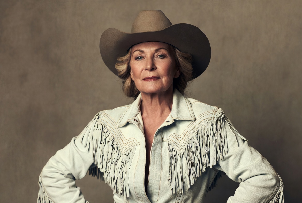 A woman stands confidently wearing a western outfit with fringe. She has a wide-brimmed hat and a strong presence in the setting.