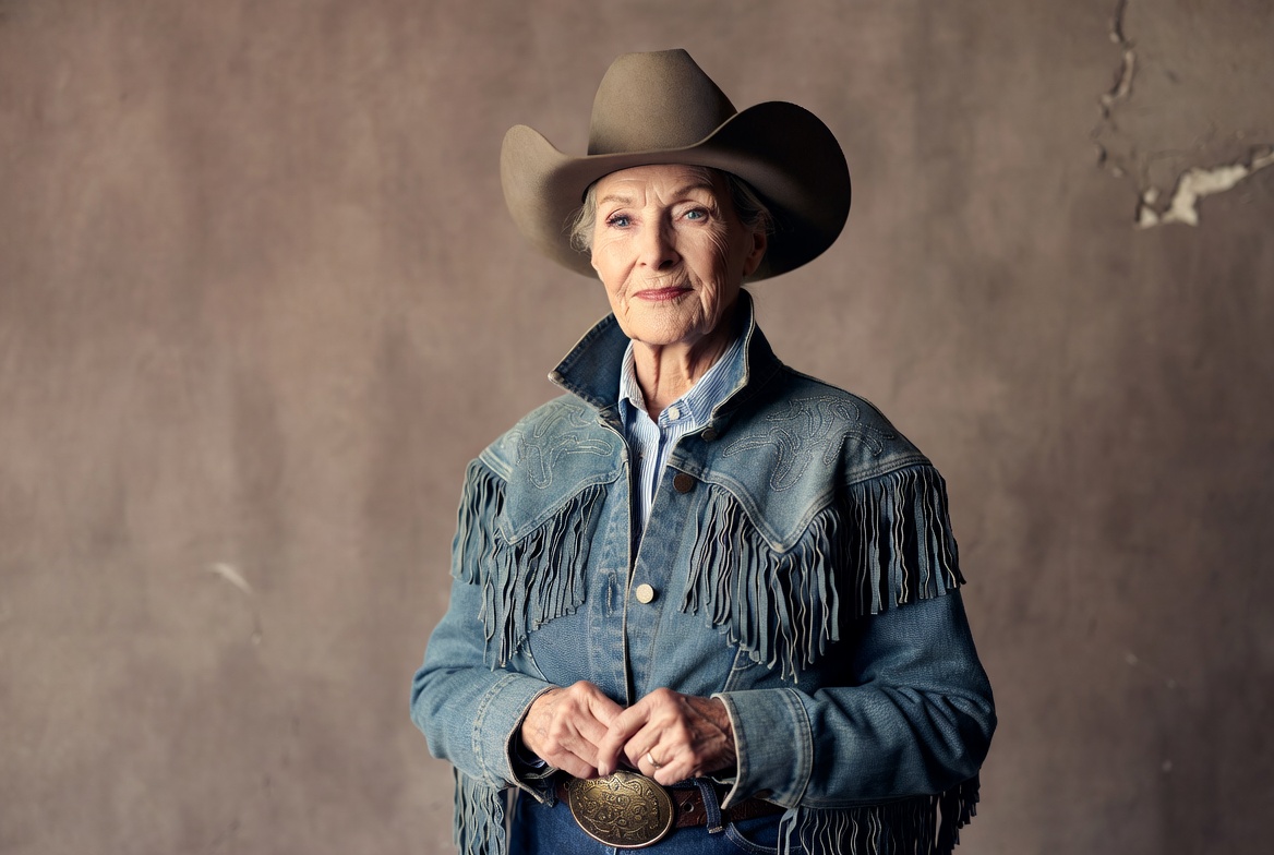 background, boots, confidence, cowboy, culture, denim, fringe, gray, hat, jacket, lifestyle, mature, nomad, portrait, ranch, standing, texture, western, western wear, woman
