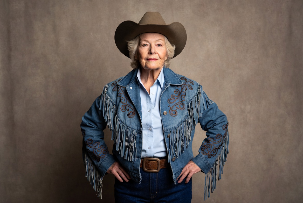 blue, casual, confidence, cowboy, culture, elder, fashion, fringes, gray hair, hat, heritage, jacket, outfit, portrait, pose, posing, style, theme, western, woman