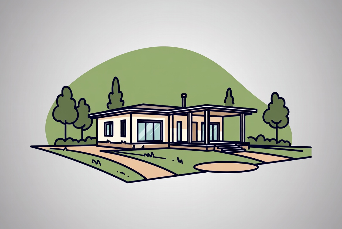 A modern house set in a green landscape. The house features large windows and a porch with a path leading up to it.
