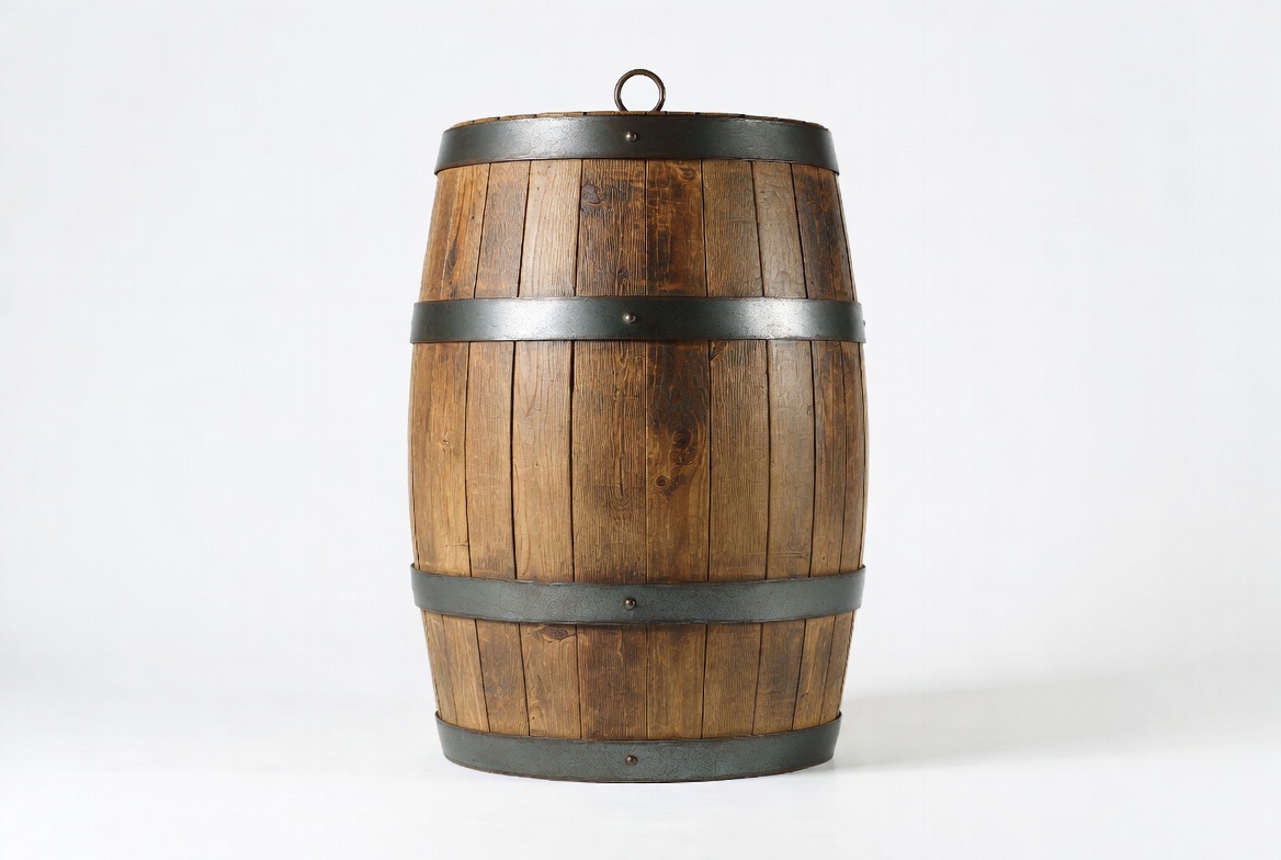A wooden barrel is positioned upright with metal bands securing its structure. The background is plain and white.