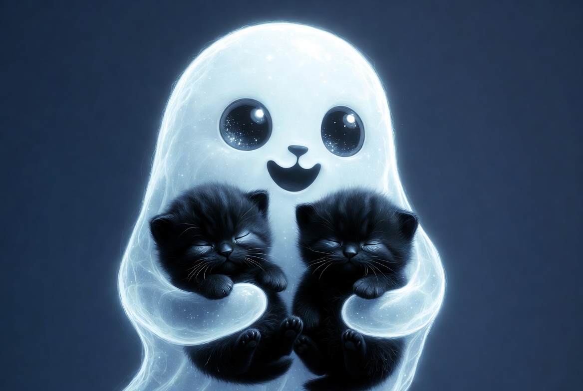 A ghost smiles while holding two black kittens close. The setting is dark, highlighting the ghost's glow and the kittens' fur.