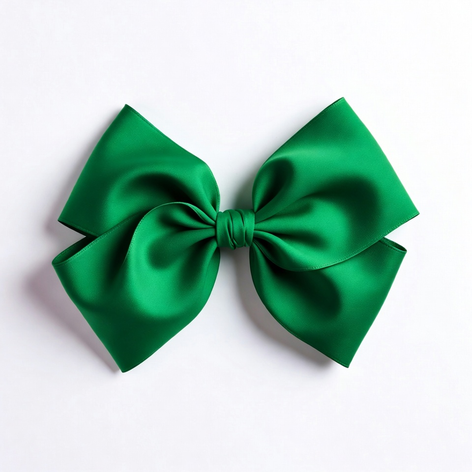 A green satin bow sits flat on a white surface, showcasing its smooth texture and neat shape suitable for gifts or decorations.
