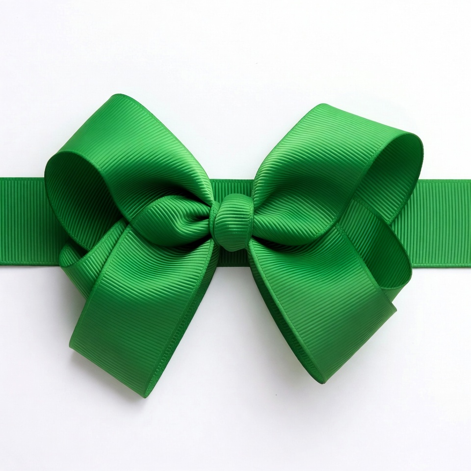 A green ribbon forms a large bow. It sits flat against a light background, ready to decorate a present or craft project.