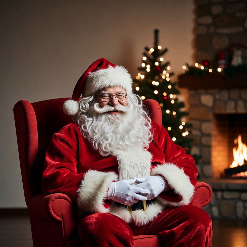 Santa Claus relaxes in a chair, smiling with a Christmas tree and fireplace in the background, ready for the holiday season.
