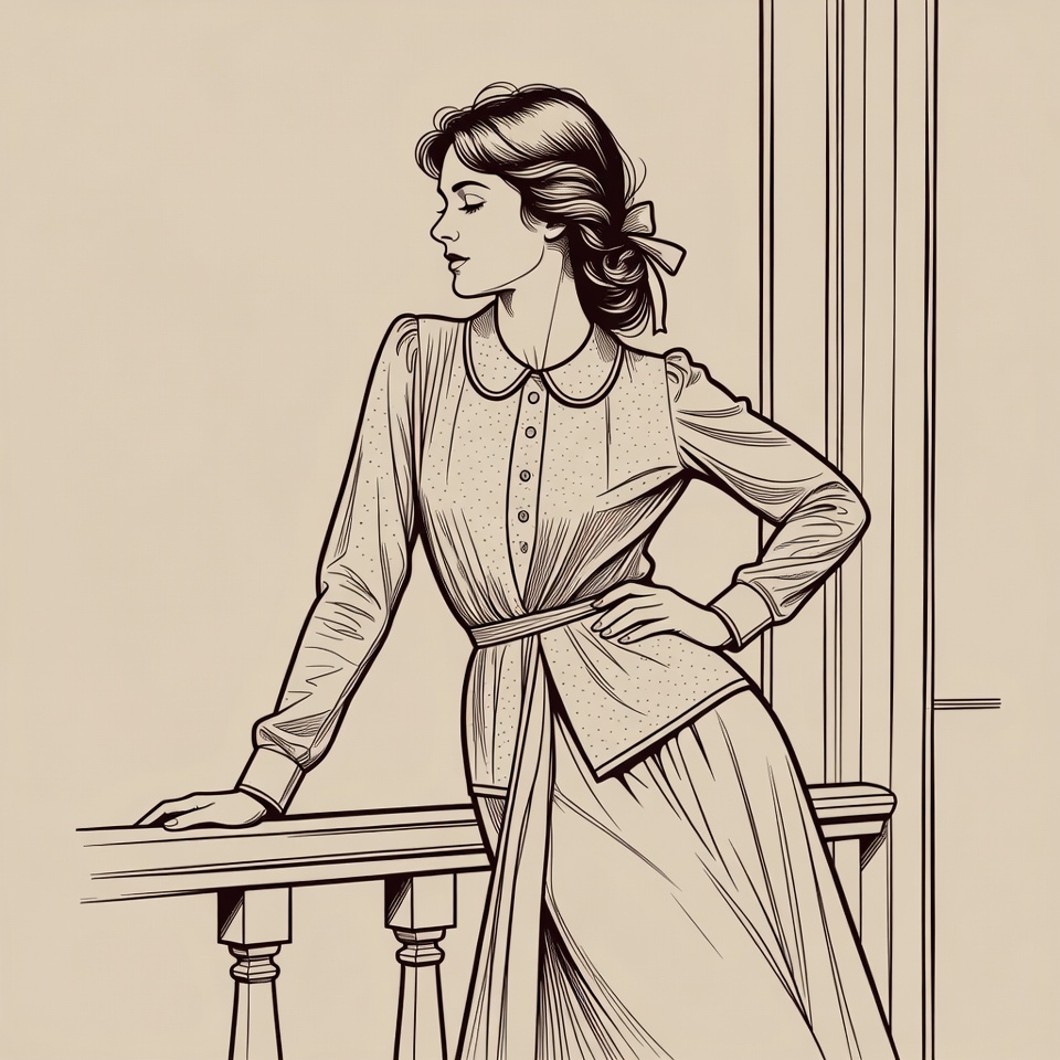A woman in a vintage outfit stands near a window. She gazes outside and rests her hand on the railing. It is bright and sunny.