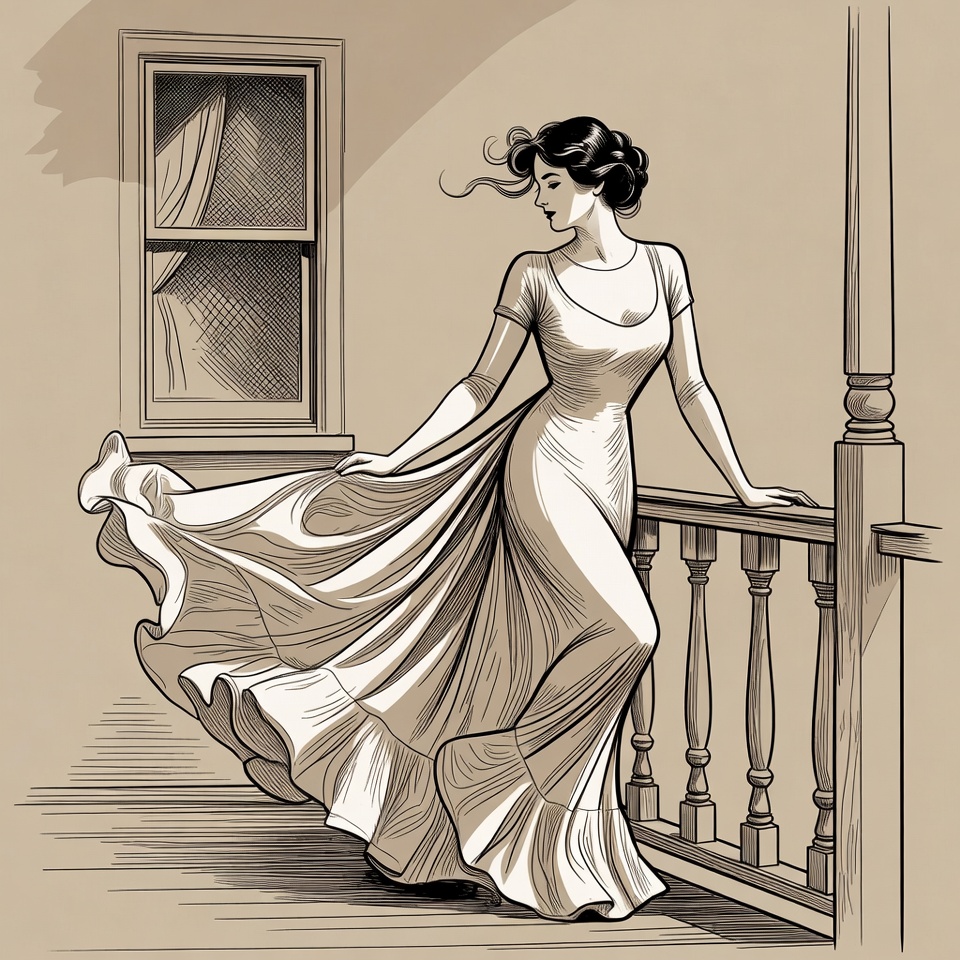 A woman stands on a balcony, holding her flowing dress. She gazes outside, with her hair blowing in the wind during the day.