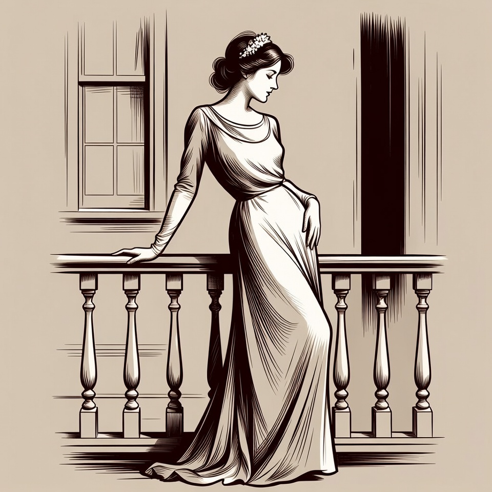 architecture, balcony, detailing, dress, elegant, fashion, gesture, hairstyle, indoors, light, looking, peaceful, pose, railing, scene, standing, style, thoughtful, vintage, woman