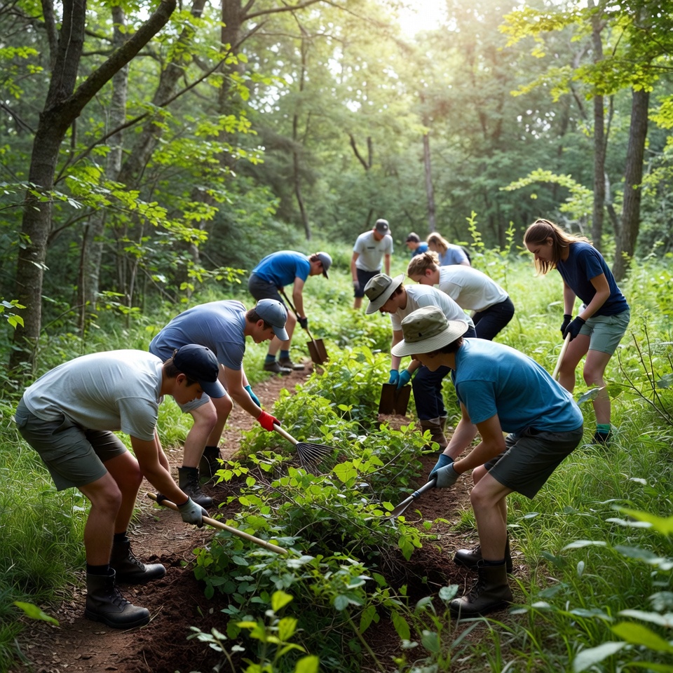clearing, community service, digging, environmental work, equipment, forest, green space, group activity, group effort, hiking trail, land care, nature, outdoor, path maintenance, plants, teamwork, teamwork effort, tools, trail restoration, volunteers