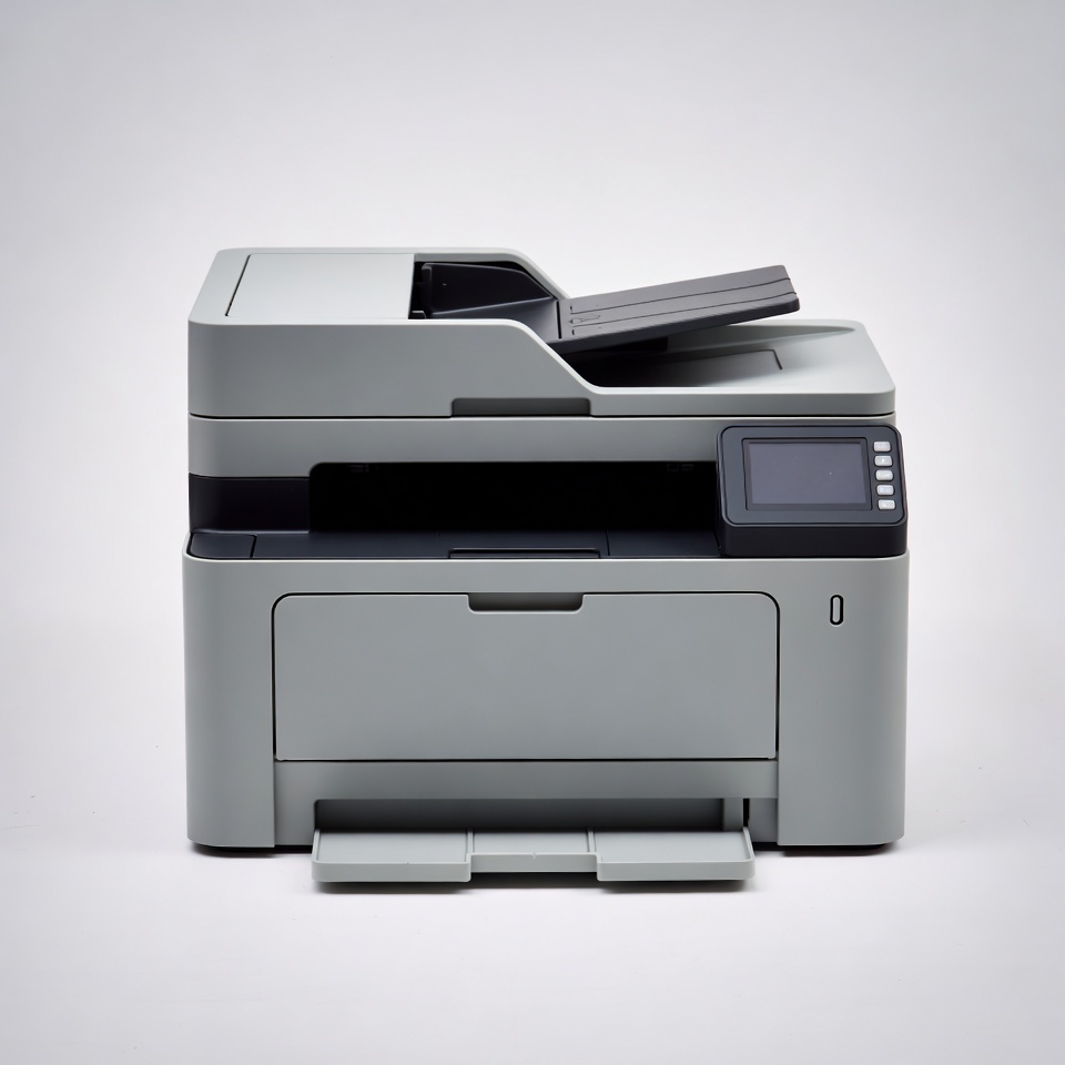 A modern office printer is located on a desk. It features a scanner on top and a control panel on the side.