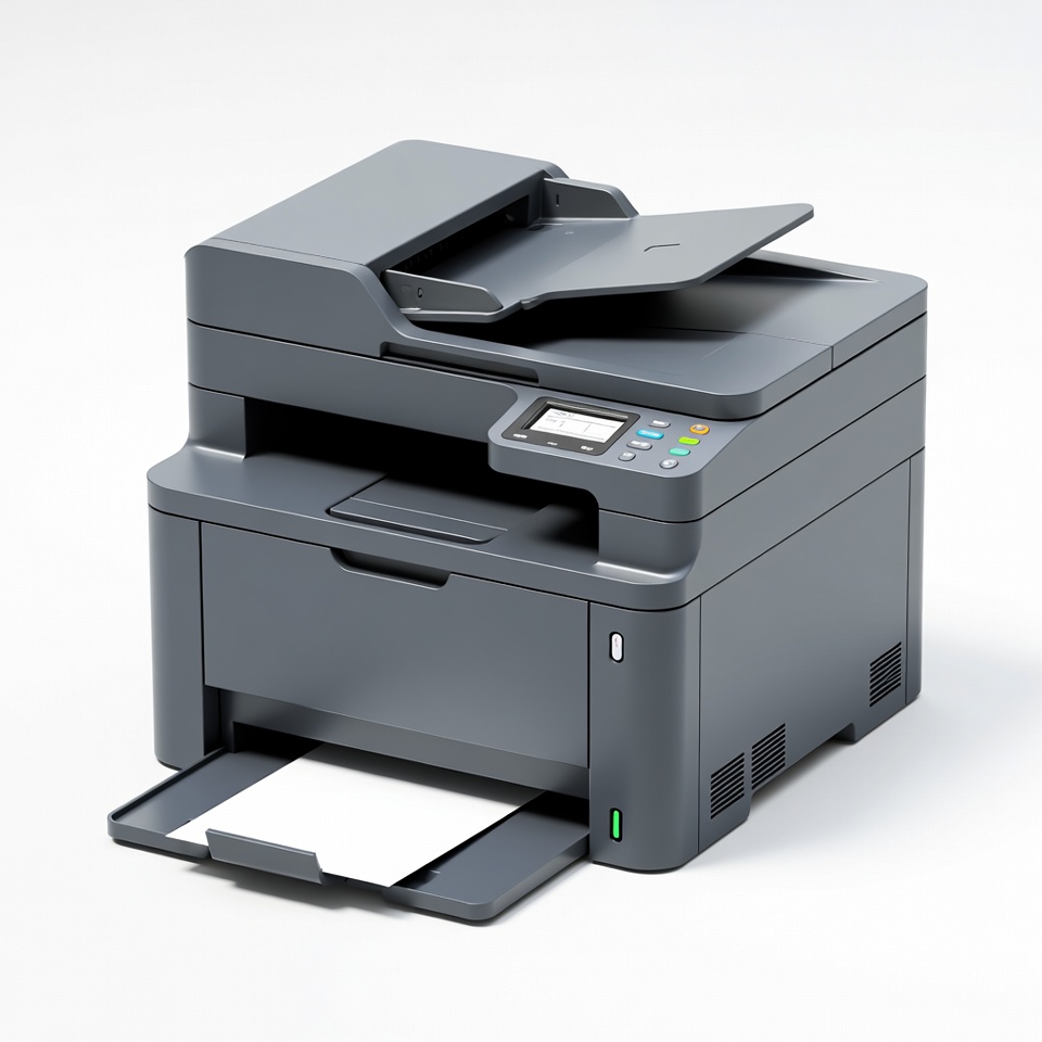 A black printer is positioned on a flat surface, ready to print multiple pages with its tray open and control panel visible.