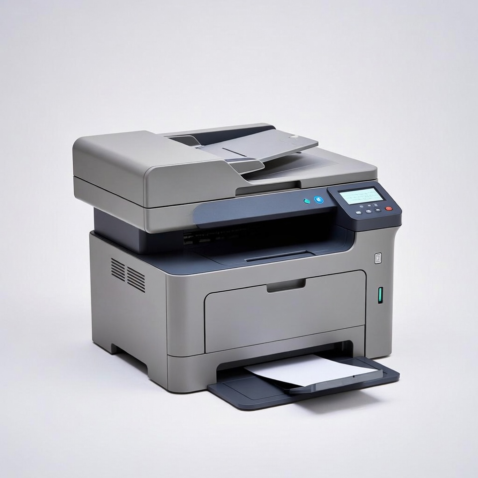 A printer is placed on a light surface. It has multiple trays and buttons for operation. It appears ready for printing tasks.