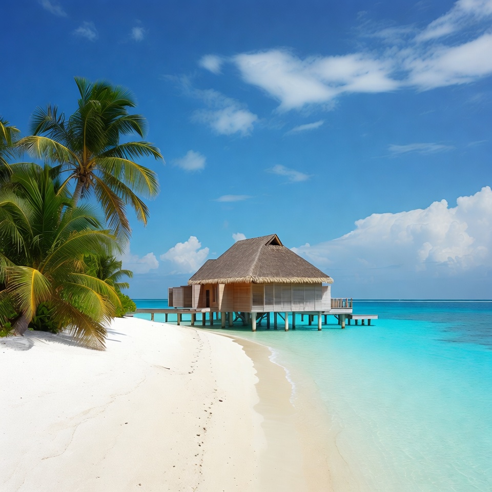 A white sand beach features an overwater bungalow. Palm trees stand tall against a bright blue sky. Waves gently lap at the shore.