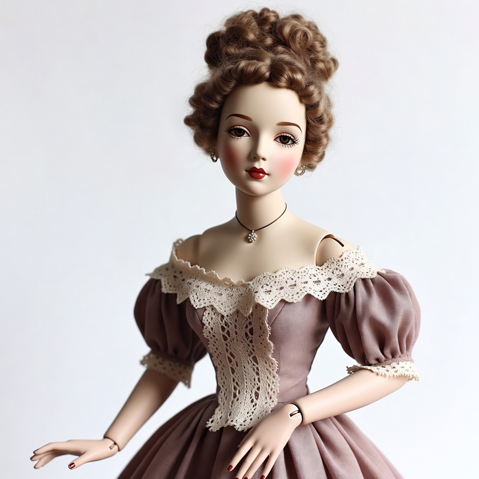 A vintage doll stands with a poised expression, wearing a detailed dress and a necklace. The background is neutral and simple.