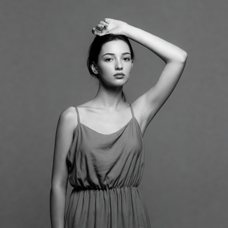 A model stands in a studio with a neutral background. She raises her hand to her forehead while wearing a simple dress.