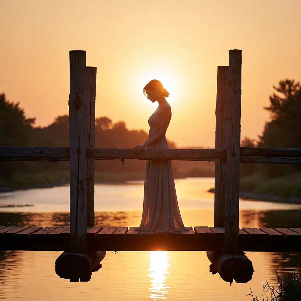 A woman in a dress stands on a wooden bridge at sunset. The sun sets behind her, casting a warm glow over the water.
