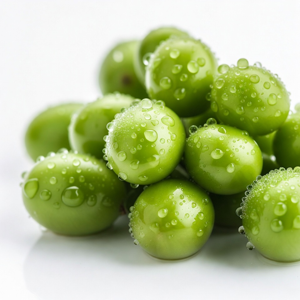 Fresh green grapes sit on a white surface, covered in small beads of water. They appear shiny and ripe, ready to eat.