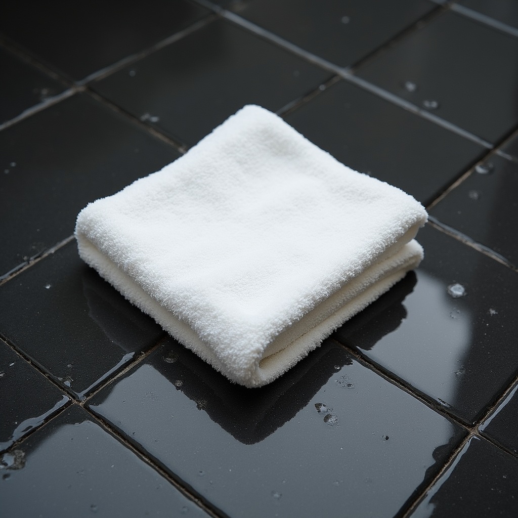 A white towel is folded neatly on black wet tiles. Water droplets can be seen on the surface, suggesting recent use or cleaning.