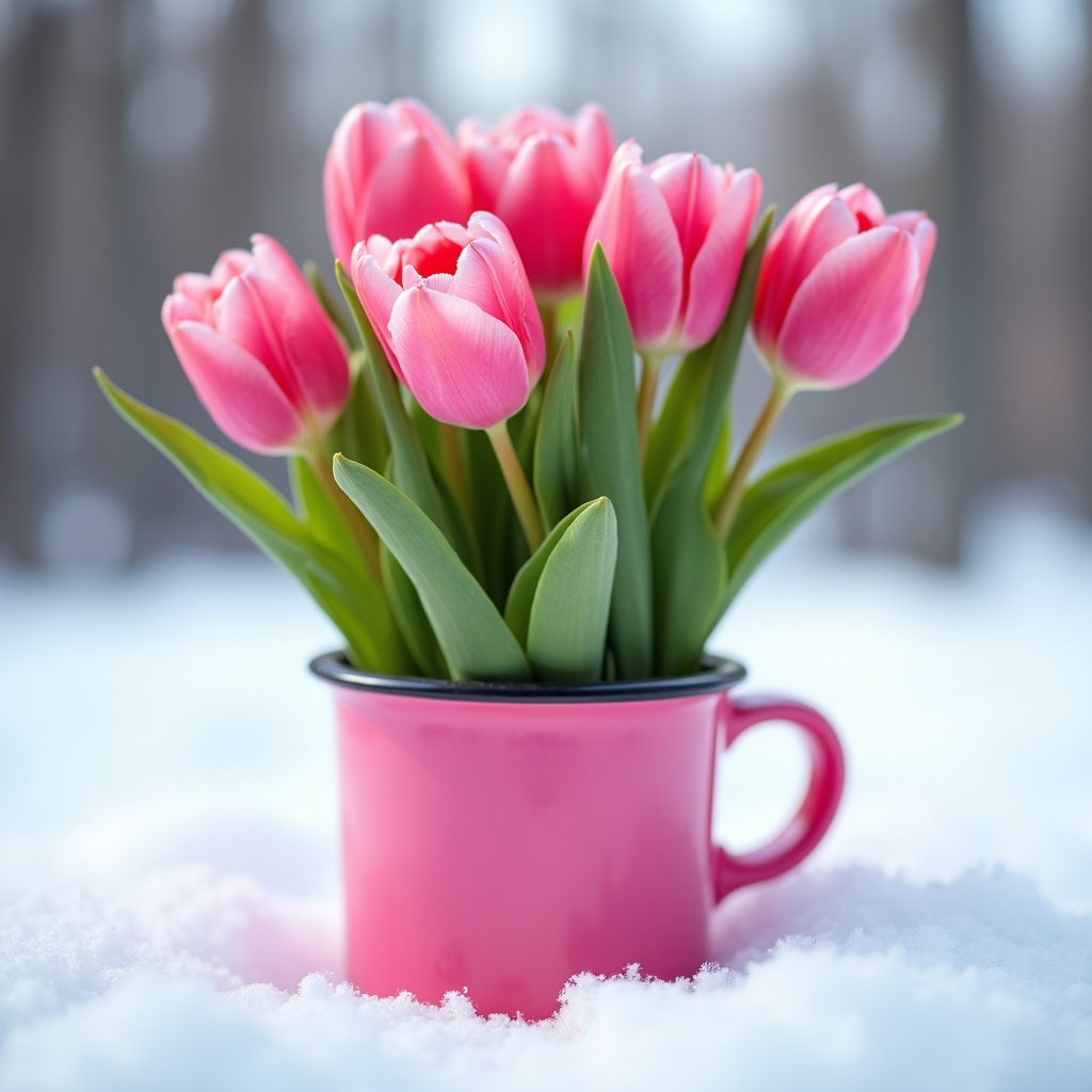 Pink tulips are arranged in a pink cup, placed on a layer of snow with a blurred background of trees in winter.