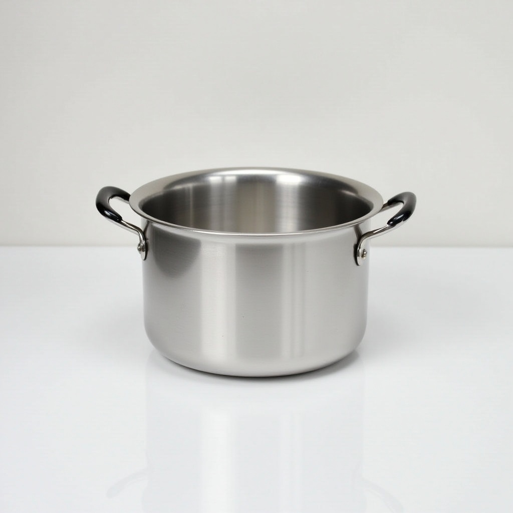 Stainless steel cooking pot on a white surface