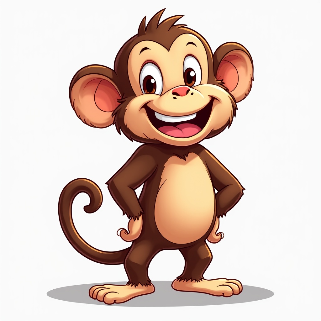 A cartoon monkey stands with hands on hips, smiling broadly. The character has large ears and a playful expression, appearing friendly and bright.