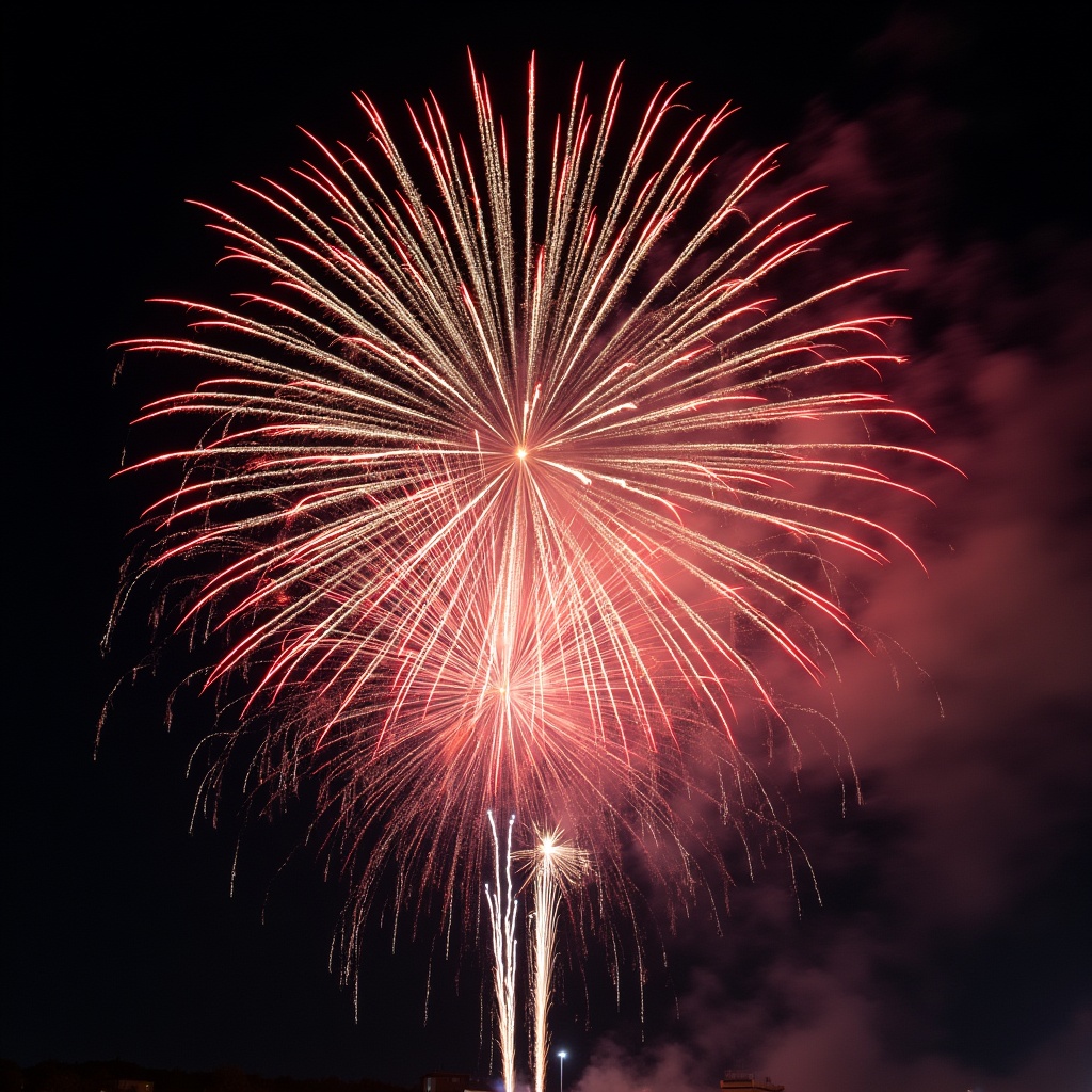 Bright fireworks light up the night sky above the city. People gather to watch the colorful show in celebration. Loud bangs fill the air.