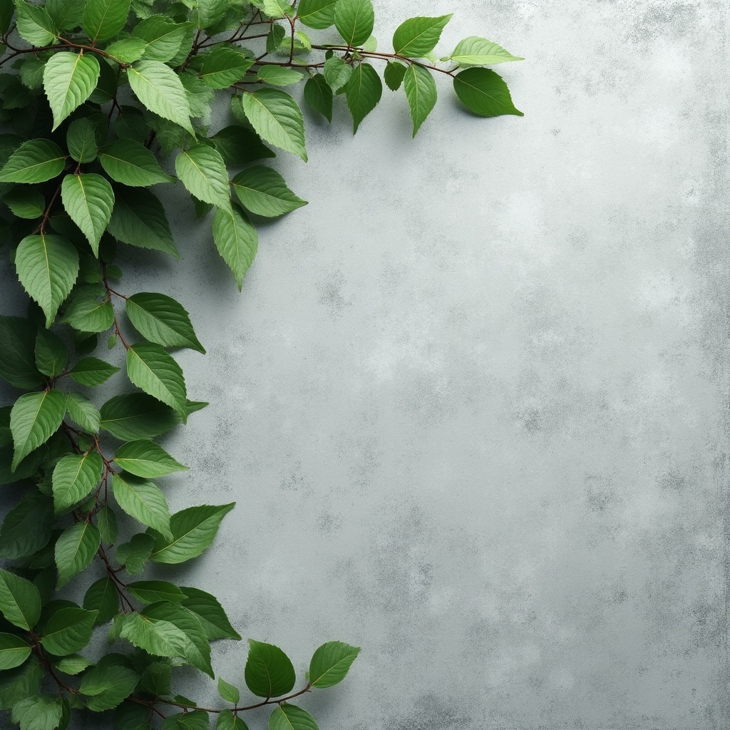 Bright green leaves and delicate vines cascade along the left and upper edges of a textured light gray surface. Natural, organic and fresh.