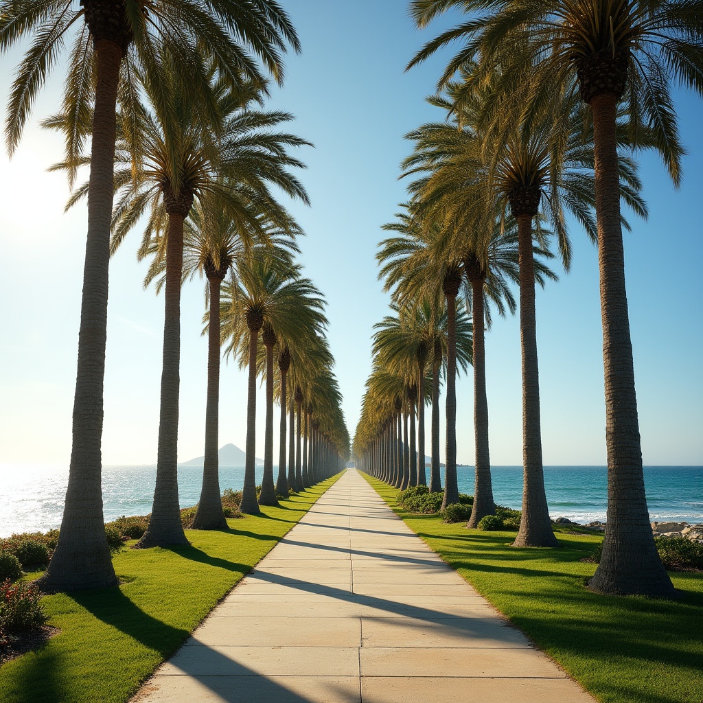 A long path extends into the distance, bordered by tall palm trees on either side. The ocean is visible beyond the trees under a bright, sunny sky.