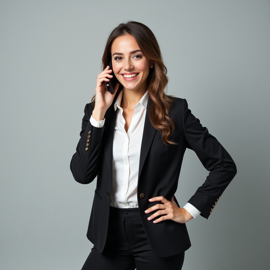 A woman in a black suit is smiling while talking on her phone in a studio. She stands confidently against a light gray background.